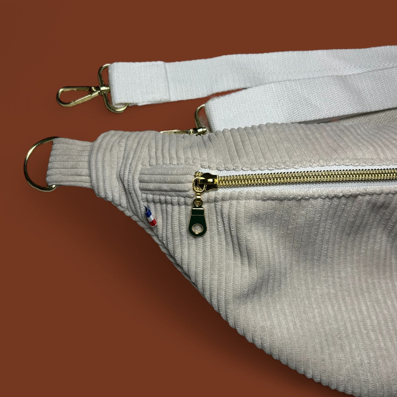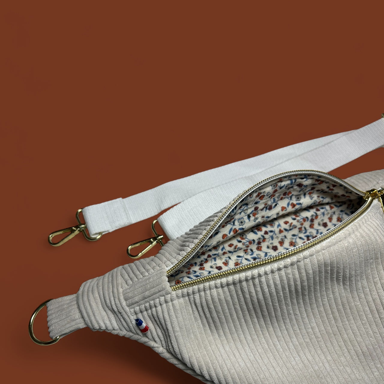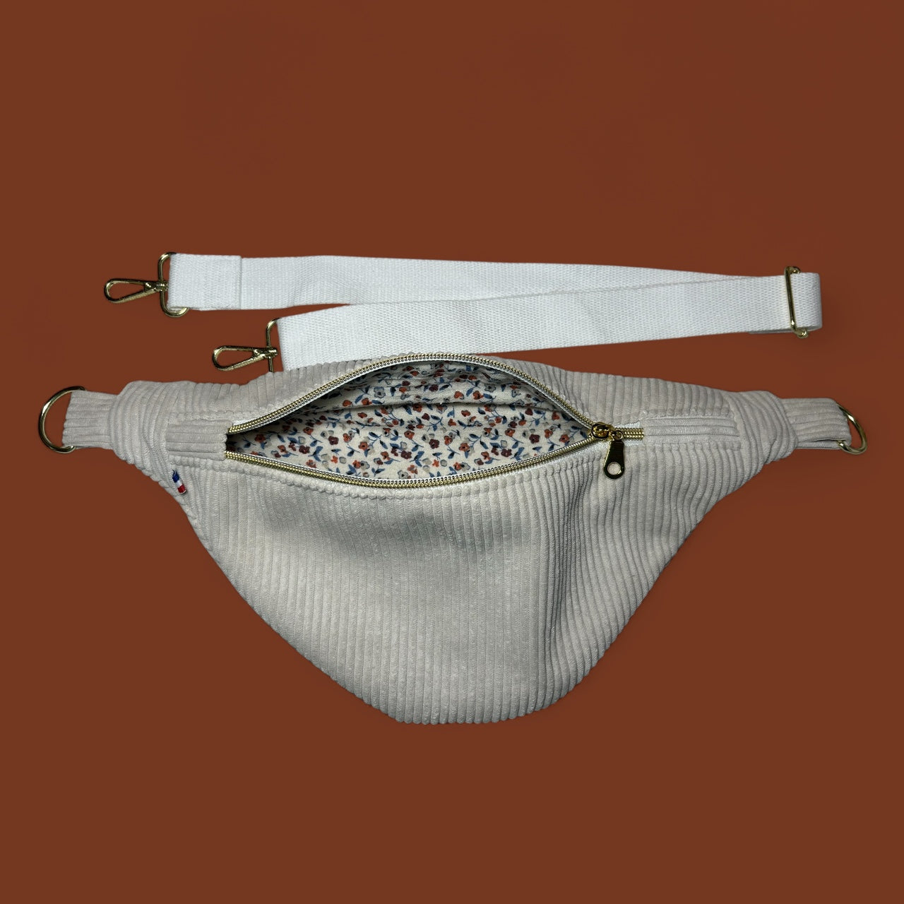 Banane velours côtelé crème, intérieur double gaze de coton motif fleuri bleu/vieux rouge.