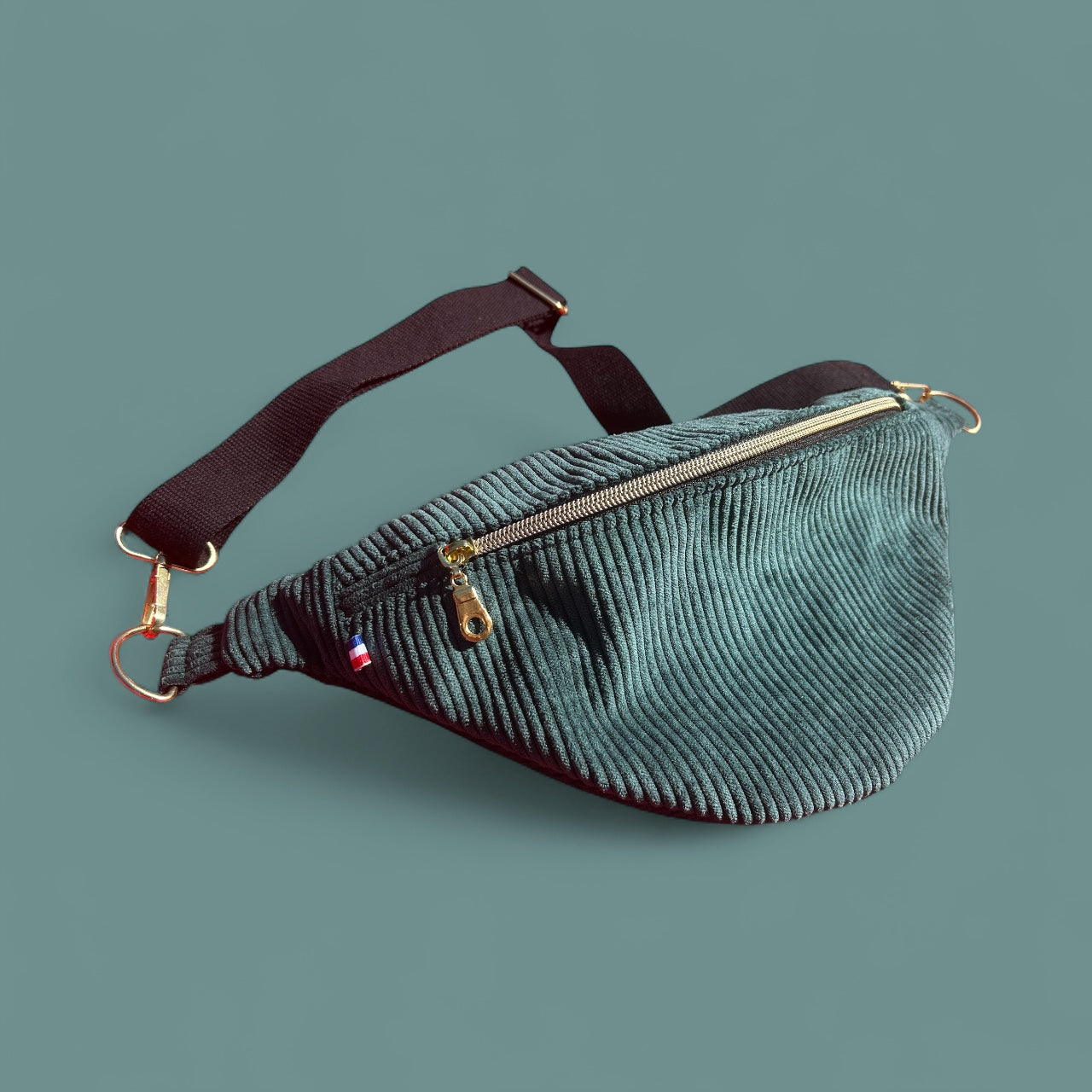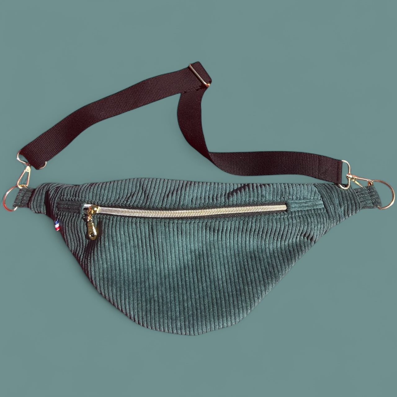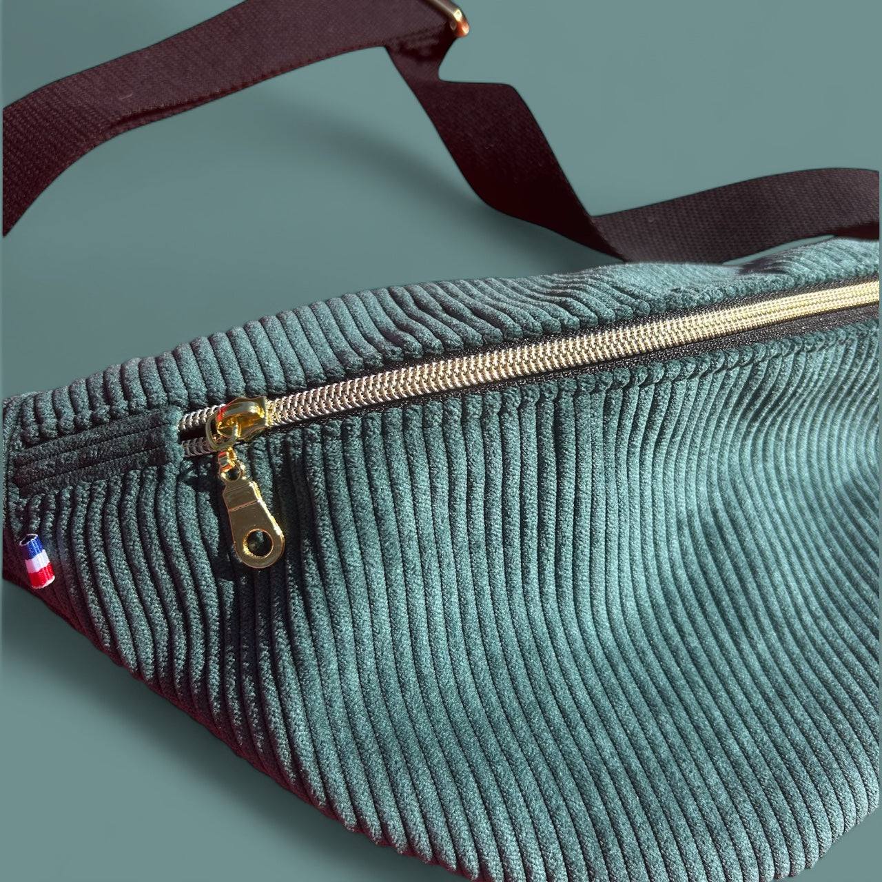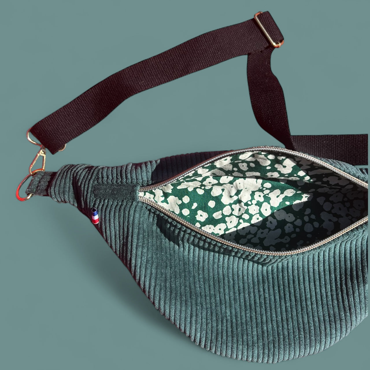 Banane velours côtelé vert sapin, intérieur vert et blanc à motifs.